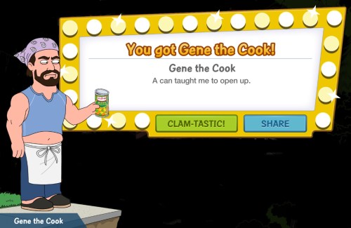 Gene The Cook is a New Character added during the Wet Hot Quahog Summer event. As with many characters in the game in order to get him you have to collect lots of stuff! You will be directed to start to unlock him at Pt. 2 of the main Questline Battle of The Bulge. Tapping on Go will take you to to the event area where you will repair the Cabin, this will bring Gene The Cook into your game to unlock.