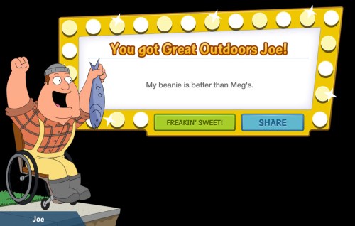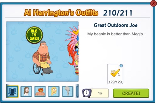 Great Outdoors Joe is a New Character Costume added during the Wet Hot Quahog Summer event. He is the prize in the first set of Achievement Tasks and in order to get him you need to collect a lot of Fishing Tackle. Tapping on Al’s will take you to the costume and you’ll see your Fishing Tackle totals there.