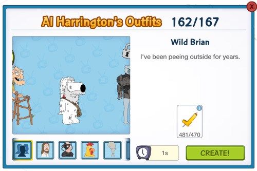Wild Brian is a New Character Costume added during the Wet Hot Quahog Summer event. He is the prize in the Second set of Achievement Tasks and in order to get him you need to collect a lot of Spears. Tapping on Al’s will take you to the costume and you’ll see your Spears totals there.