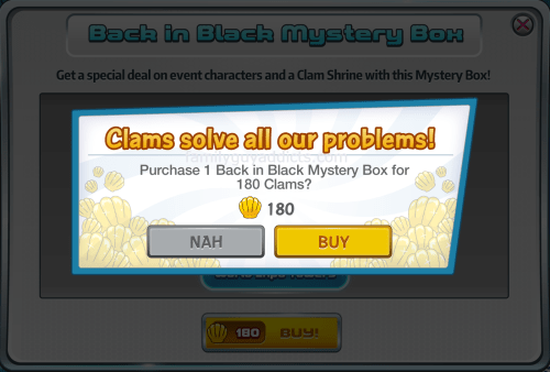 As it takes a few steps to get there, as well as a WARNING POP UP asking you if you are SURE that you want to spend your Clams for a try that you have to accept… accidentally spending money on the Mystery Box is nearly impossible.