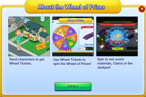 Wheel Ticket (Common): Lois Buy Tickets OR Chris Spin Until He Pukes OR Game Show Cleveland Flatter Contestants (always) OR Big Money Mystery Box