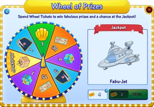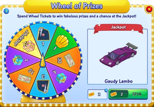 Either will bring up the Wheel Of Prizes Main Screen, which shows you the prizes, Jackpot and the cost to Spin.
