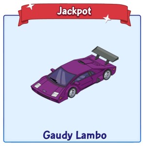 Below are all the Jackpot prizes we’ve seen so far and if you seen anything we haven’t please tell us about it in the comments.  I’ll also say not that I’ve been very lucky and NOT won the Gaudy Lambo as yet. Hello-o-o!!!