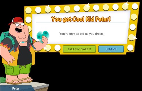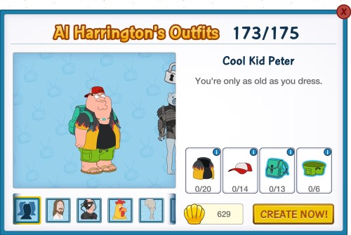Cool Kid Peter is a New Character Costume added during the The Fast Times At Griffin High event. As with many costumes in the game in order to get him you have to collect lots of stuff! You will be directed to unlock him via the He’s All That questline. Tapping on Go will take you to Al’s where he can be made.