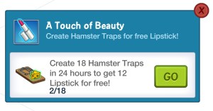 A new and very welcome Task should be dropping in your games NOW to help you add to your Lipstick total and thus help you unlock Cher. So look out for the A Touch Of Besuty task and starting creating those Hamster Traps.