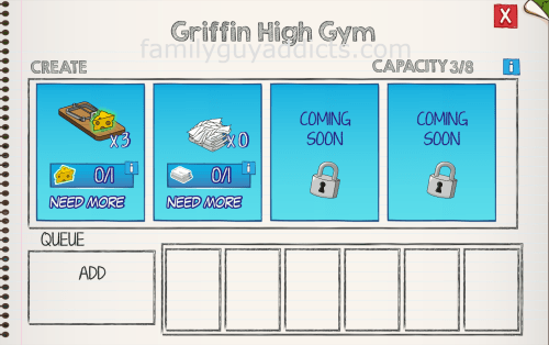 Go to the Event Area and tap on the Griffin High Gym. The Pop Up will appear. There you will see the Basics of the Griffin High Gym. The current items you have available to Create, the Current Capacity of items you have, and any items in Queue.