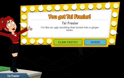 Tai Frasier is a new premium Character released as part of the Fast Times At Griffin High event. As with all premiums, it is your choice to determine whether or not she is someone you want to add to your game. She is the top prize in the Gym Class Mystery Box which costs 150