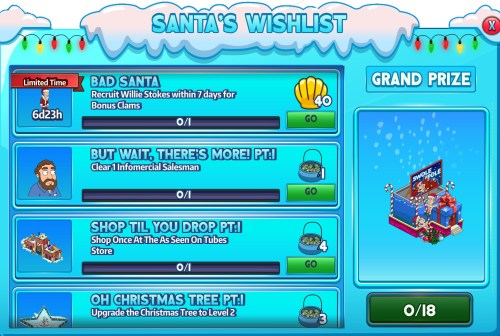 Here is the list of what I currently see in my game for this Weeks Santa’s Wishlist (as you clear one or progress through Main Questline, another will appear)…
