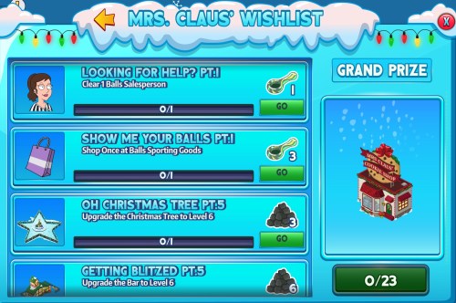 Here is the list of what I currently see in my game for this Weeks Santa’s Wishlist (as you clear one or progress through Main Questline, another will appear)…
