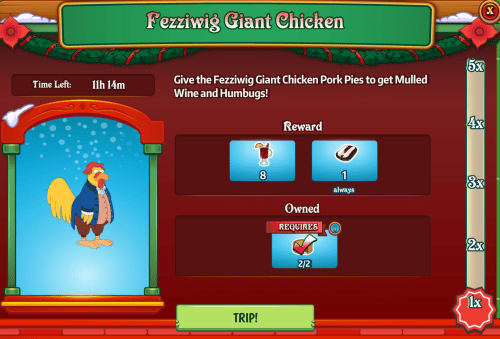 The Fezziwig Giant Chicken Boss will trigger as soon as you start week 1 of the event. You will “Trip” him with the Pork Pies you craft in the Pie Shoppe to get defeat him to the highest level possible and obtain the most prizes.