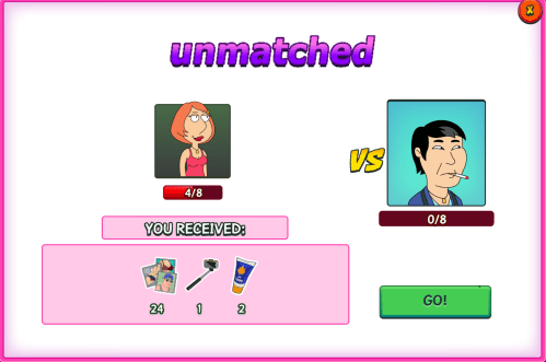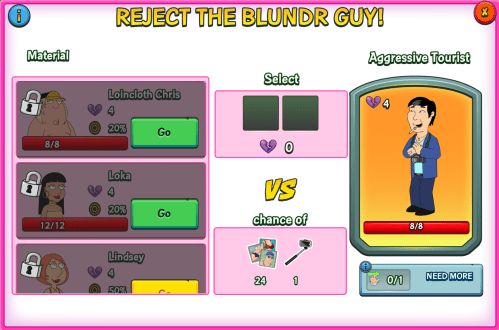 During the Side Questline, Art Of Blundr Dating, you will trigger the Aggressive Tourists in your Quahog. You will have to wait for them to appear before you can reject them, and you’ll need to have one of this weeks event characters unlocked, unless you buy Lindsey. So unless you bought her you’re not going to be going into battle with these for a while. So concentrate on unlocking Loincloth Chris and/or Loka for now. And don’t panic, you’ll get there.