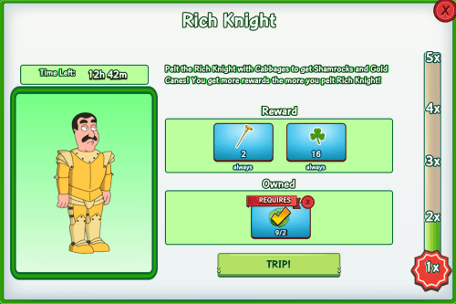 The Rich Knight Boss will appear as soon as you trigger Part 1 of the main Questline. This is your Main Boss this week of the Event. You will “Pelt” him with Cabbage you collect during the Event. You need to defeat him to the highest level possible and obtain the most prizes.