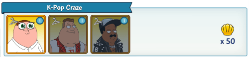 Characters/Costumes Required To Complete Collection: K-Pop Joe, K-Pop Peter, K-Pop Cleveland (note not all characters are available yet)