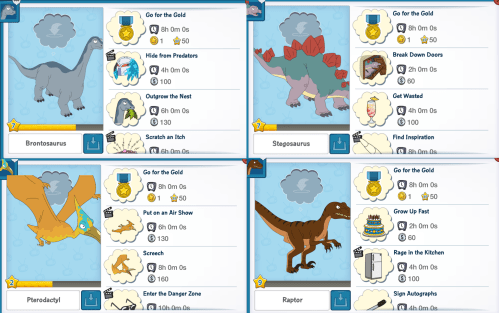 The characters you can now level up are Brontosaurus, Stegosaurus, Pterodactyl and Raptor. At this time only the Go For Gold task earns XP, but that’s the task most of you will be putting them on at this time.
