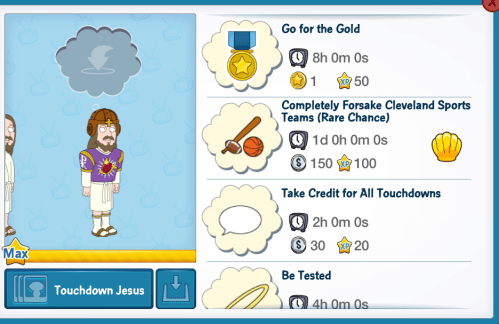Jesus’ Turn Water Into Clams and Touchdown Jesus’ Completely Foresake Cleveland Sports Teams are now just below their Going For Gold tasks. No more scrolling to the bottom to find it.