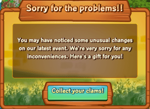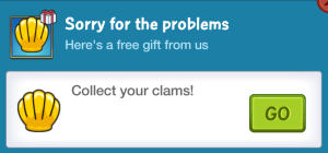 You should all be seeing a little gift of 30 Clams from Jam City to apologise for the event issues.